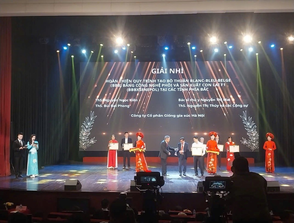 Công ty Cổ phần Giống gia súc Hà Nội đã xuất sắc đạt được giải Nhì lĩnh vực với giải pháp: “Hoàn thiện quy trình tạo bò thuần Blanc – Bleu – Belge (BBB) bằng công nghệ phôi và sản xuất con lai F1 (BBB x Senepol) tại các tỉnh phía Bắc” của đại diện nhóm tác giả – Ông Nguyễn Ngọc Kiên –Phó Tổng giám đốc công ty.